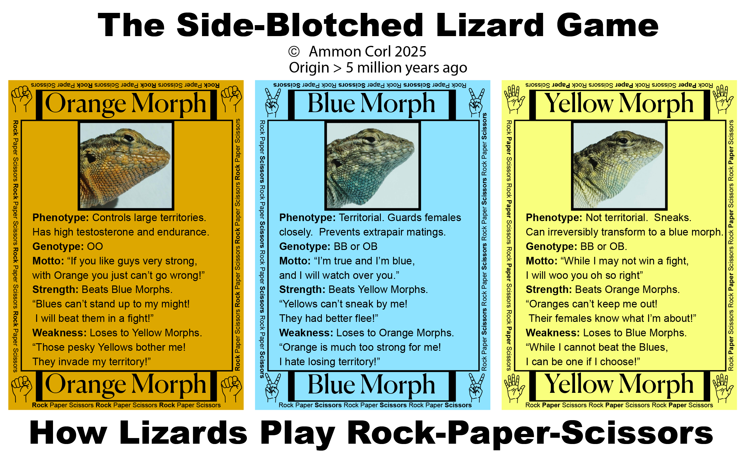 The PBS show "Deep Look" made a video about the rock-paper-scissors game in side-blotched lizards. I recommend it to anyone interested in the learning more about side-blotched lizards and their rock-paper-scissors game.