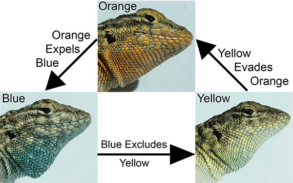 For many years I have studied the side-blotched lizard, Uta stansburiana, a species that is polymorphic for three male mating strategies characterized by distinct throat colors and mating behaviors. The mating strategies are maintained by an evolutionary analog of the rock-paper-scissors game wherein orange males take territory from blue males because they are more aggressive, yellow males beat orange males by sneaking onto their large territories, and blue males beat yellow males by closely guarding their mates. I have determined the genetic basis of this polymorphism through a large genomic study, which revealed that the color morphs differ in variants at a single gene called sepiapterin reductase. I have also used population genetic models to better understand how the polymorphism is maintained. In addition, I have studied the geographic variation of the side-blotched lizard polymorphism and determined that it has been maintained for millions of years, but can sometimes be lost. I also have investigated other color polymorphisms to better understand their genetics and maintenance. This work was done in collaboration with the labs of Barry Sinervo at U.C. Santa Cruz and Rasmus Nielsen at U.C. Berkeley.